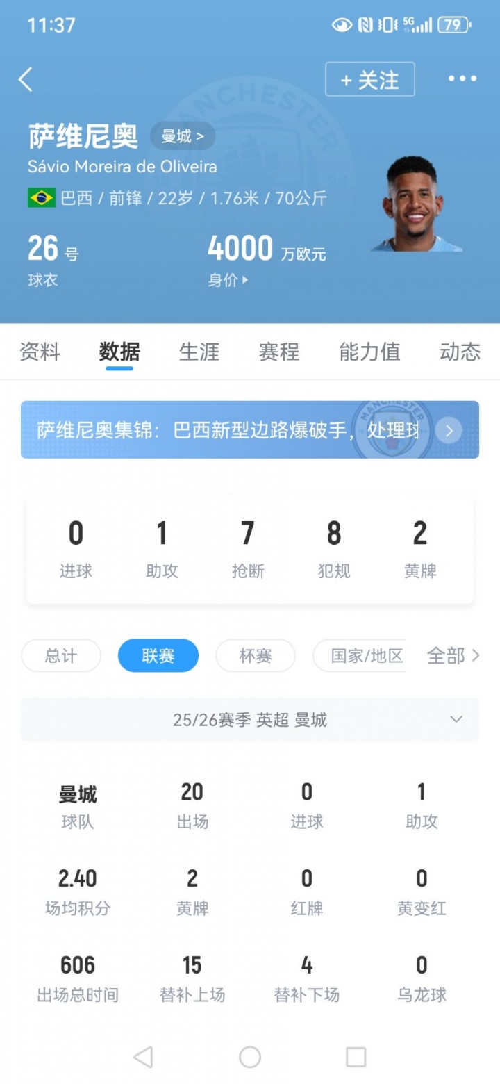 本赛季22岁萨维尼奥整体表现难以让人满意,大多数时间都作为替补出场。萨维尼奥本赛季代表曼城出战32场,仅有12次首发,贡献3球2助攻,其中联赛和欧冠0球。